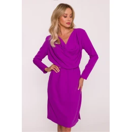 Elegantné štíhle šaty z hladkej tkaniny s jemným, mierne lesklým povrchom. Model očarí zmyselným výstrihom vodného typu, ktorý jemne padá na telo a zdôrazňuje ženský charakter šiat. Dlhé rukávy dodávajú celku eleganciu a robia z tejto kreácie skvelý kúsok na večerné vychádzky a elegantné stretnutia. Strih s voľnejším horným dielom a zúženou spodnou časťou krásne tvaruje postavu a elastický pás z rovnakého materiálu zvýrazňuje pás. Spodná časť šiat má jednoduchý strih s jemným rozparkom na boku, ktorý zabezpečuje voľnosť pohybu. Šaty nemajú zapínanie, nosia sa pohodlne cez hlavu. Navrhnuté a ušité v Poľsku s dôrazom na každý detail.