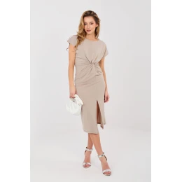 Elegantné šaty v tvare ceruzky, ideálne na večierok alebo slávnostnú udalosť. Sú vyrobené z príjemnej zmesi polyesteru a viskózy, krásne sa prispôsobia postave a poskytujú ľahkosť a eleganciu. Šaty majú hladký dizajn, okrúhly výstrih a krátke rukávy a ozdobný zavinovací predný diel jemne tvaruje postavu a dodáva jej charakter. Rozparok do polovice stehien dodáva jemný, zmyselný akcent a midi dĺžka zdôrazňuje eleganciu oblečenia. Bez zapínania sa šaty pohodlne nosia a klasický ceruzkový strih dokonale odhaľuje ženskú postavu. Je to ponuka pre ženy, ktoré ocenia eleganciu, pohodlie a jemnú zmyselnosť v jednom.