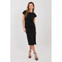 Elegantné olovené šaty, ideálne na večierok alebo návštevu. Sú vyrobené z príjemnej zmesi polyesteru a viskózy, krásne sa prispôsobia postave a poskytujú ľahkosť a eleganciu. Šaty majú hladký vzor, okrúhly výstrih a krátke rukávy, vpredu s ozdobným záhybom, ktorý jemne modeluje postavu a dodáva jej charakter. Rozparok v spodnej časti siahajúci po stehná dodáva jemný, zmyselný akcent a midi dĺžka zdôrazňuje eleganciu strihu. Bez zapínania sa šaty pohodlne nosia a klasický strih olovených šiat dokonale odhaľuje ženskú postavu. Je to ponuka pre ženy, ktoré ocenia eleganciu, pohodlie a jemnú zmyselnosť v jednom.