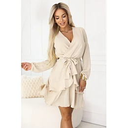 Predstavte si východiskový bod, keď chcete vyzerať žensky a cítiť sa pohodlne. Táto béžová zavinovacia sukňa je ideálna na stretnutie, večeru alebo dôležitý výlet, keď je dôležitý sebavedomý, klasický efekt. Je to model, ktorý môžete ľahko skombinovať s lodičkami alebo členkovými čižmami a vytvoriť tak outfit na svadbu, krstiny alebo rande. Sukňa má zavinovací srdiečkový výstrih a dlhé rukávy s mäkkým lemom. V páse je šnúrka na úpravu obvodu a zvýraznenie siluety. Spodná časť je mini v kvietkovanom strihu, zakončená vrstvenými volánmi, ktoré dodávajú ľahkosť. poľské prevedenie.