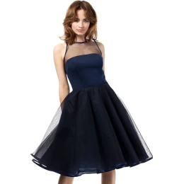 Večerné šaty prestrihnuté v páse. Najlepšie padnúce s tylovým výstrihom zviazaným na chrbte zamatovou stuhou. Púzdrové, vrstvené s tylovou vrchnou vrstvou doplnenou saténovým lemovaním.