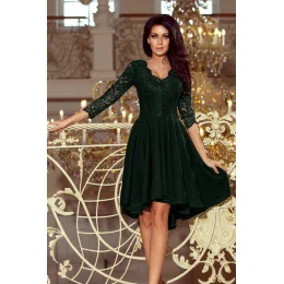 Asymetrické tmavo zelené exkluzívne šaty Nicolle s dlhším chrbtom, 3/4 rukávmi, výstrihom a čipkou. Sukňa s dlhším zadným dielom bude ideálna pre tanec. Vyrobené v Poľsku.