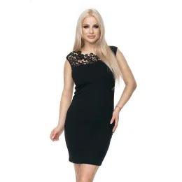 Mini šaty s gipurom vo výstrihu. Šaty rovného strihu, vypasované. Šaty bez rukávov.