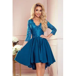 Asymetrické exkluzívne šaty s dlhším chrbtom, 3/4 rukávmi, výstrihom a čipkou. Šaty v morskej farbe. Sukňa s dlhším chrbtom bude ideálna pre tanec. Vyrobené v Poľsku. Značka Numoco.