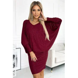 Netopierie šaty s výstrihom. Vyrobené z elastickej tkaniny s trblietkami. Dá sa nosiť rovno alebo voľne. Šaty vo vínovej farbe. Značka numoco. Poľská výroba.
