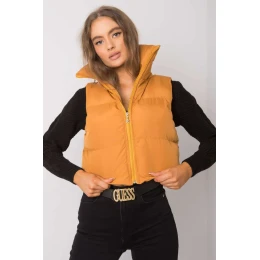 Tmavo žltá vesta so skrytou kapucňou. Vesta na zips.