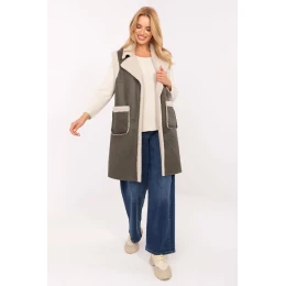 Táto štýlová dámska vesta s kožušinou je skvelou voľbou na jeseň/zimu. Je vyrobená z kvalitného polyesteru, je ľahká, pohodlná a ideálna na vrstvenie. Model s dlhšou dĺžkou bez zapínania na gombíky je zachovaný v hladkom vzore, čo zdôrazňuje jeho minimalistický, ležérny charakter. Ďalšou výhodou sú vsadené, vložené vrecká, ktoré dodávajú praktickosť a uvoľnený štýl. Je to skvelá ponuka na každý deň ako štýlová prechodná bunda bez podšívky alebo výplne.