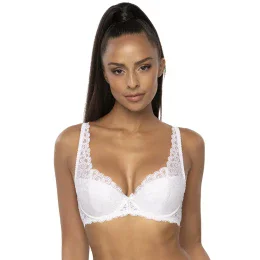Dámska vystužená podprsenka. Košíčky a mostík sú vyrobené z krásnej čipky. Medzi košíčkami je saténová mašľa s visačkou. Ramienka nastaviteľné, neodnímateľné, predĺžené, čipkované. Ramienka podopierajú a tvarujú prsia, zadná časť je z čipky. Bez veľkých bočných kostí.