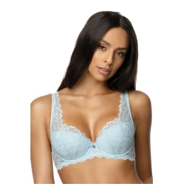 Úžasná podprsenka Carmela. Vypadá krásne na každom poprsí. Vyrobená je celá z mäkkej čipkovej tkaniny v modrej farbe, ktorá sa sexi prehýba na prsiach a stúpa na ramienkach. Ramienka sú nastaviteľné, neodnímateľné. Dvojradové zapínanie s trojcestným nastavením.
