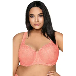 Fenomenálna veľká podprsenka Carmela, dostupná vo veľkých veľkostiach. Krásne zvýrazní dekolt, dokonale stiahne poprsie. Široké ozdobné ramienko umožňuje zakryť asymetriu pŕs. Košíčky sú vyrobené z mäkkej broskyňovej čipky, ktorá sexi objíma prsia a jemne sa plazí po ramienku. Tvarované košíčky sú posadené na čipkovanej kostici a čipkovanom chrbte, ktorý bol vystužený elastickou sieťovinou. Ramienka sú nastaviteľné, neodnímateľné. Zapínanie na dvojitý háčik a očko s trojcestným nastavením.