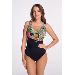 SKJ 67 sú elegantné jednodielne plavky pre ženy, ktoré oceňujú luxus a pohodlie. Vrchný diel upúta pozornosť exotickou intenzívnou potlačou, ktorá nápadne kontrastuje s jednoliatym čiernym spodným dielom. Výstrih do V krásne zvýrazňuje poprsie a mäkké vystužené košíčky poskytujú mierne nadvihnutie a prirodzený tvar bez podšívky, čím zabezpečujú pohodlie a jemnú oporu.