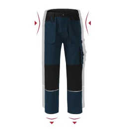 elastická bočná časť bedrového goliera 7 multifunkčných vreciek zdvojený materiál v oblasti kolien a sedadla plastové "D" pútko a karabína na kľúče a identifikačné karty pútko na kladivo dvojité prešitie pre vyššiu odolnosť reflexné prvky