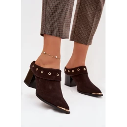 Dámske sandále z prírodného semišu sú výnimočnou ponukou pre ženy, ktoré rady nosia módne doplnky inšpirované westernovým štýlom. Mäkká koža dodáva čižmám elegantný vzhľad a zaručuje pohodlie pri nosení, vďaka čomu je model ideálny na výnimočné udalosti. Charakteristickým prvkom je zahnutý golier na nárte, ktorý zdôrazňuje originálny strih a dodáva nezameniteľný štýl. Špicatá špička zdobená zlatými detailmi prináša jemný, elegantný akcent a opticky zjemňuje chodidlo. Čižmy sú umiestnené na stabilnom stĺpikovom podpätku, ktorý zaručuje pohodlie pri chôdzi a jemne zvýrazňuje siluetu. Sú to veľkolepé sandále s výrazným charakterom, ktoré dokonale doplnia outfit so šatami, sukňami alebo elegantnými nohavicami.