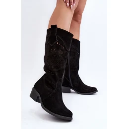 Zazoo 4043 Zamszowe Kozaki Na Niskim Obcasie Ażurowe Czarne