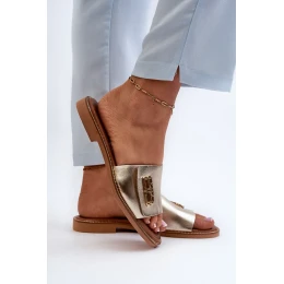 Elegantné dámske žabky z prírodnej kože. Osadené na plochom podpätku. Zlaté zdobenie na prednej strane. Vďaka vysokej kvalite spracovania sa tieto žabky stanú nepostrádateľným prvkom letného stylingu! Pri výbere veľkosti sa riaďte tabuľkou veľkostí.