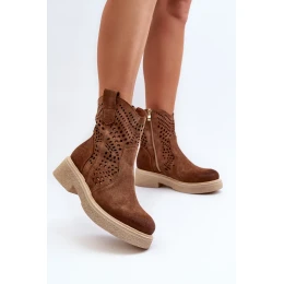 Zazoo Dámske semišové čižmy na plochom podpätku, ažurové, hnedé