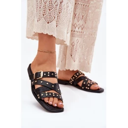 Zdobione Klapki Damskie Na Płaskim Obcasie Z Paskami I Klamrą Czarne Manitte