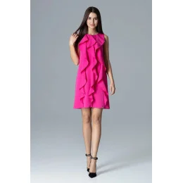 Trapézové šaty bez rukávov s vertikálnymi volánmi. Model bez vreciek, bez podšívky, ušitý zo skvelého materiálu dodá ľahkosť a šik každej štylizácii. Skvelá voľba pre ženy, ktoré si cenia eleganciu.