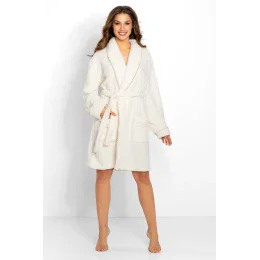 Túžite po relaxácii? Večer si oblečte teplý, nadýchaný a mäkký župan, ktorý vaše telo zahalí a dodá mu mimoriadne príjemný pocit. Župan Glamour je náš návrh na relaxáciu vo veľmi elegantnom prostredí. Golier aj rukávy župana sú zakončené zlatým lemovaním, ktoré nielen krásne vyzerá, ale tiež priťahuje pozornosť. Okamžite v ňom budete vyzerať ako princezná. Župan je vyrobený z mimoriadne mäkkého a kvalitného úpletu a je v krásnej svetlej ecru farbe. V páse je viazačka a na bokoch sú dve vrecká. Zlatá výšivka loga značky na hrudi.
