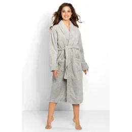 Dlhý elegantný dámsky župan so šálovým golierom. Vyrobené z vysoko kvalitnej, mäkkej, hebkej pleteniny s jemnou štruktúrou. Dlhé rukávy zakončené manžetou. Vrecká na bokoch v úrovni bokov. Viazanie v páse.