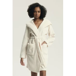 Mäkký a pohodlný župan pre ženy s voľným a pohodlným strihom, ktorý zaručuje úplnú voľnosť pohybu a komfort pri nosení. Je vyrobený z teplého materiálu príjemného na dotyk, dokonale udržiava teplo, ideálny na chladnejšie dni a večery. Model má kapucňu, praktické vrecká a pás, ktorý umožňuje prispôsobiť sa vašej postave. Vďaka dĺžke po kolená je ľahký a pohodlný na nosenie. Župan sa dodáva vo fóliovom vrecku, skvelý aj ako darček.