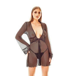 Zmyselný čierny župan v podobe jemného negližé s hlbokým výstrihom. Zdobené krajkovými vsadkami pod prsiami aj na rukávoch. Vzdušné a neuveriteľne luxusné. Lákavo zviazané uprostred. Môžete ju nosiť na spodnom prádle alebo na nahom tele.